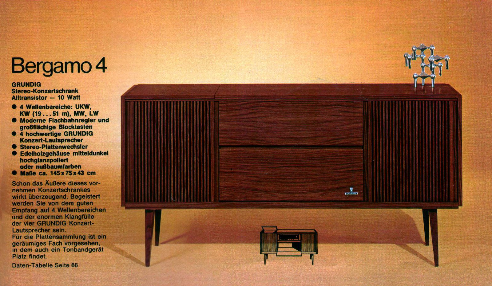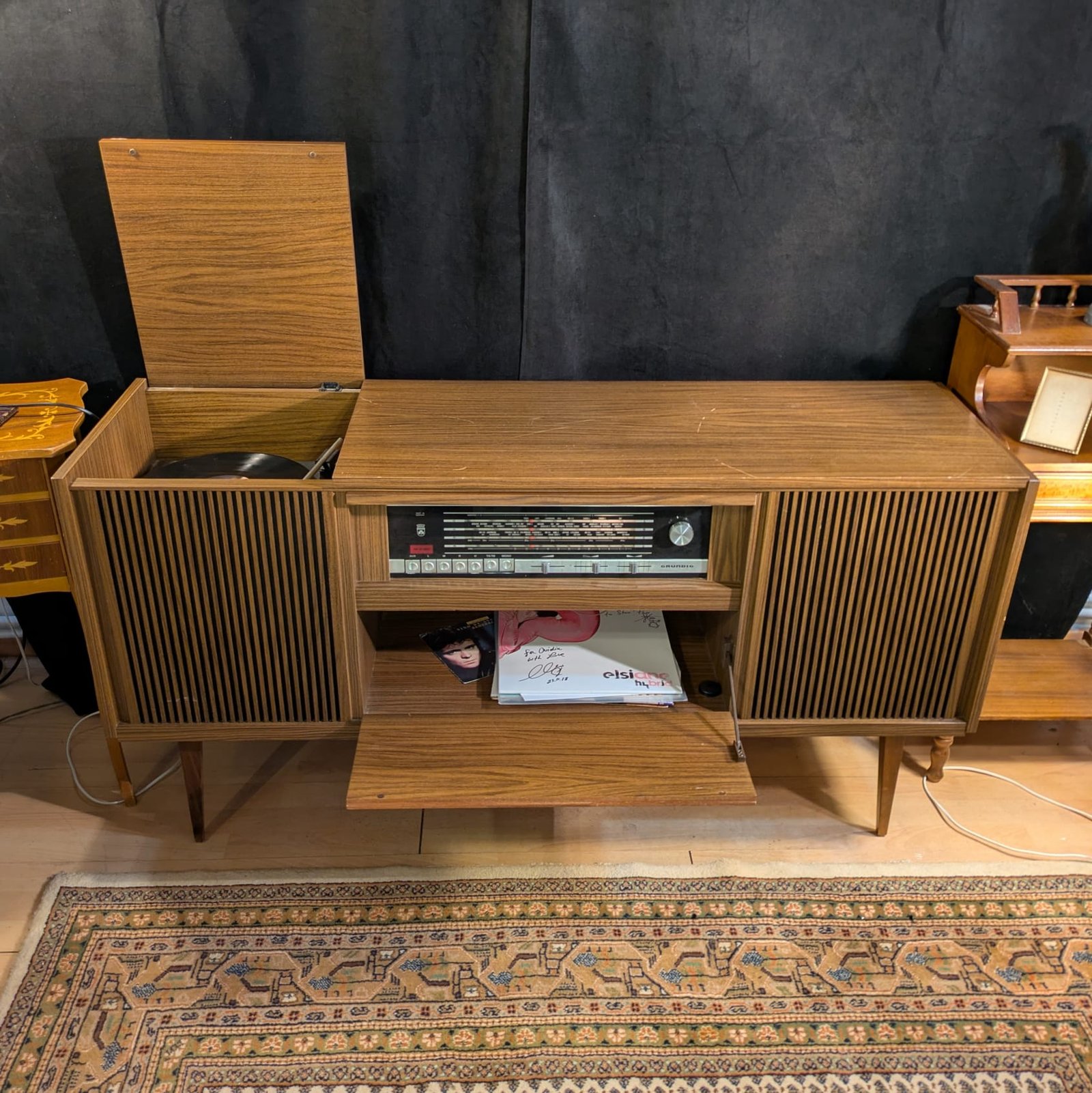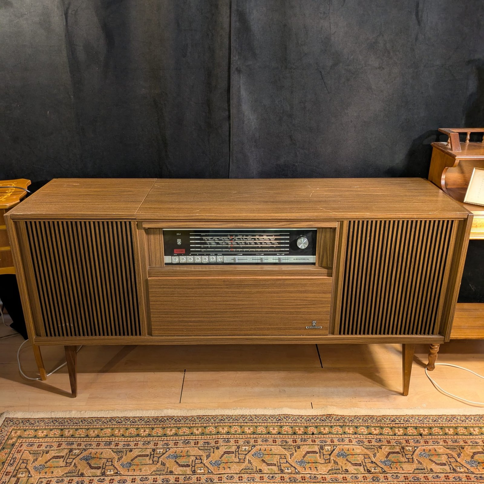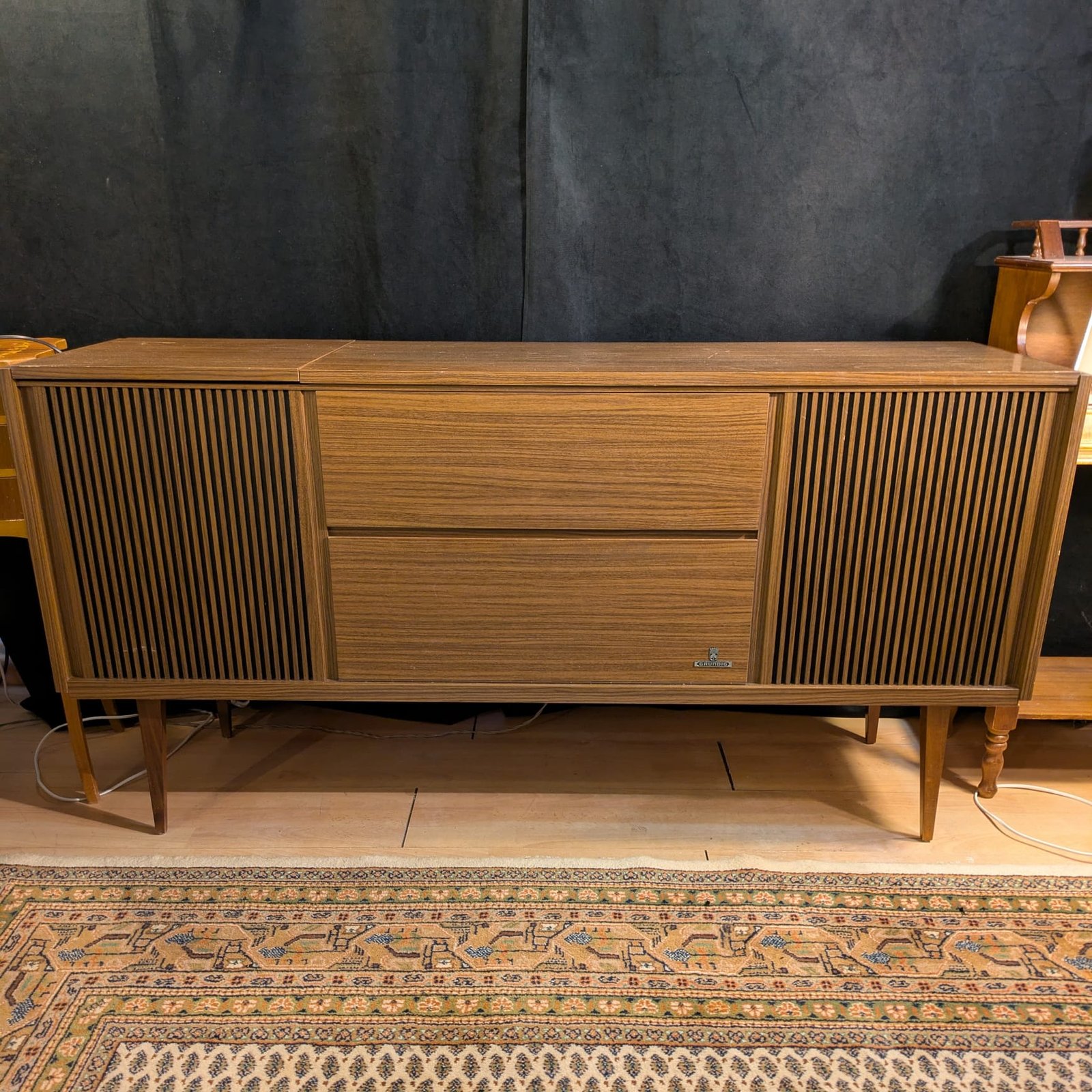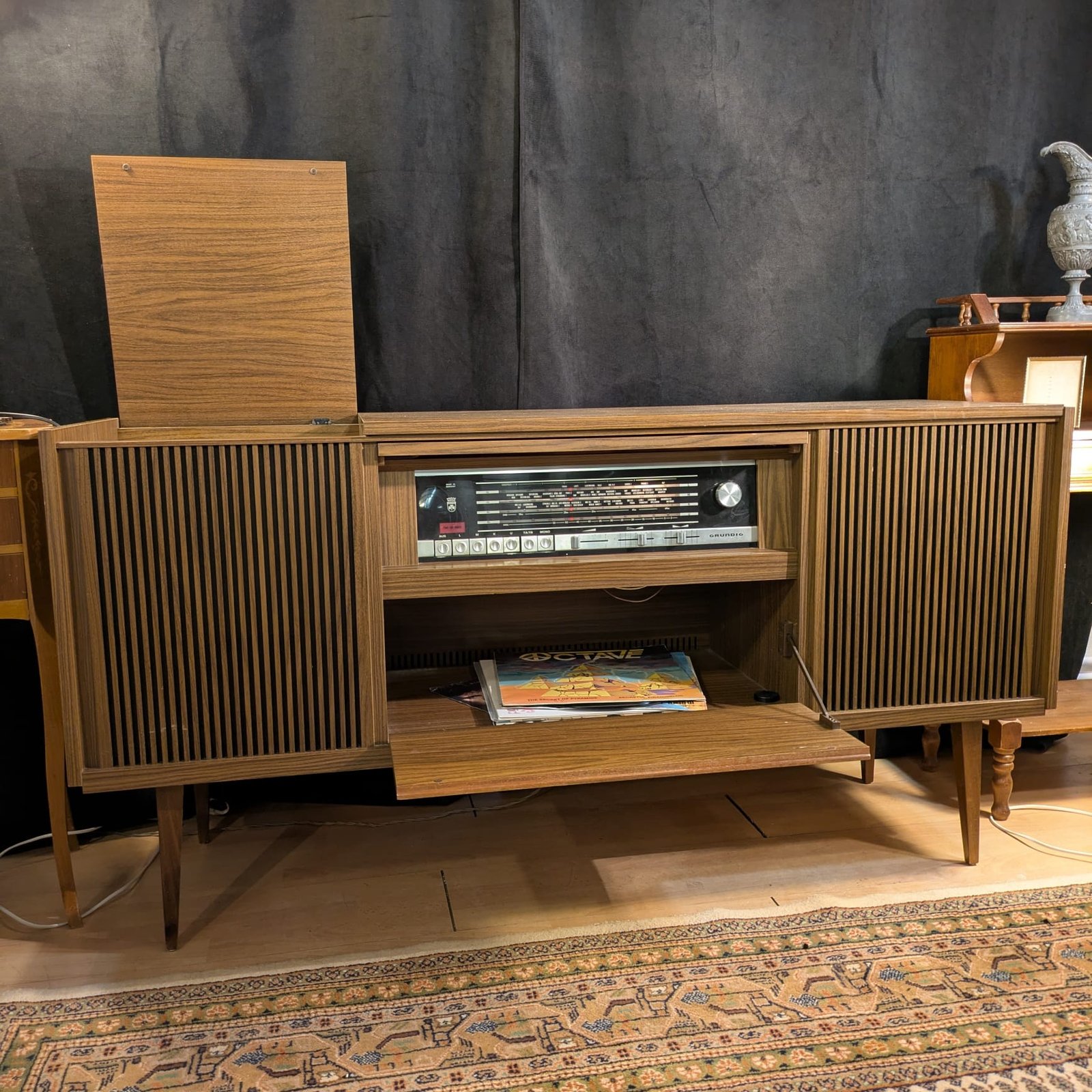 + transport gratuitComodă audio Grundig Bergamo 4a absolut minunată cu design Mid Century Modern. Fabricată în 1973 în Germania de Vest. Modelul mai exact este: Stereokonzertschrank Bergamo 4a nr. 53000. Destul de grea dar poate fi ridicată de 2 persoane. Este un aparat cu adevărat minunat, cu un sunet curat, așa cum se cuvine unei carcase din lemn și unui produs nemțesc.