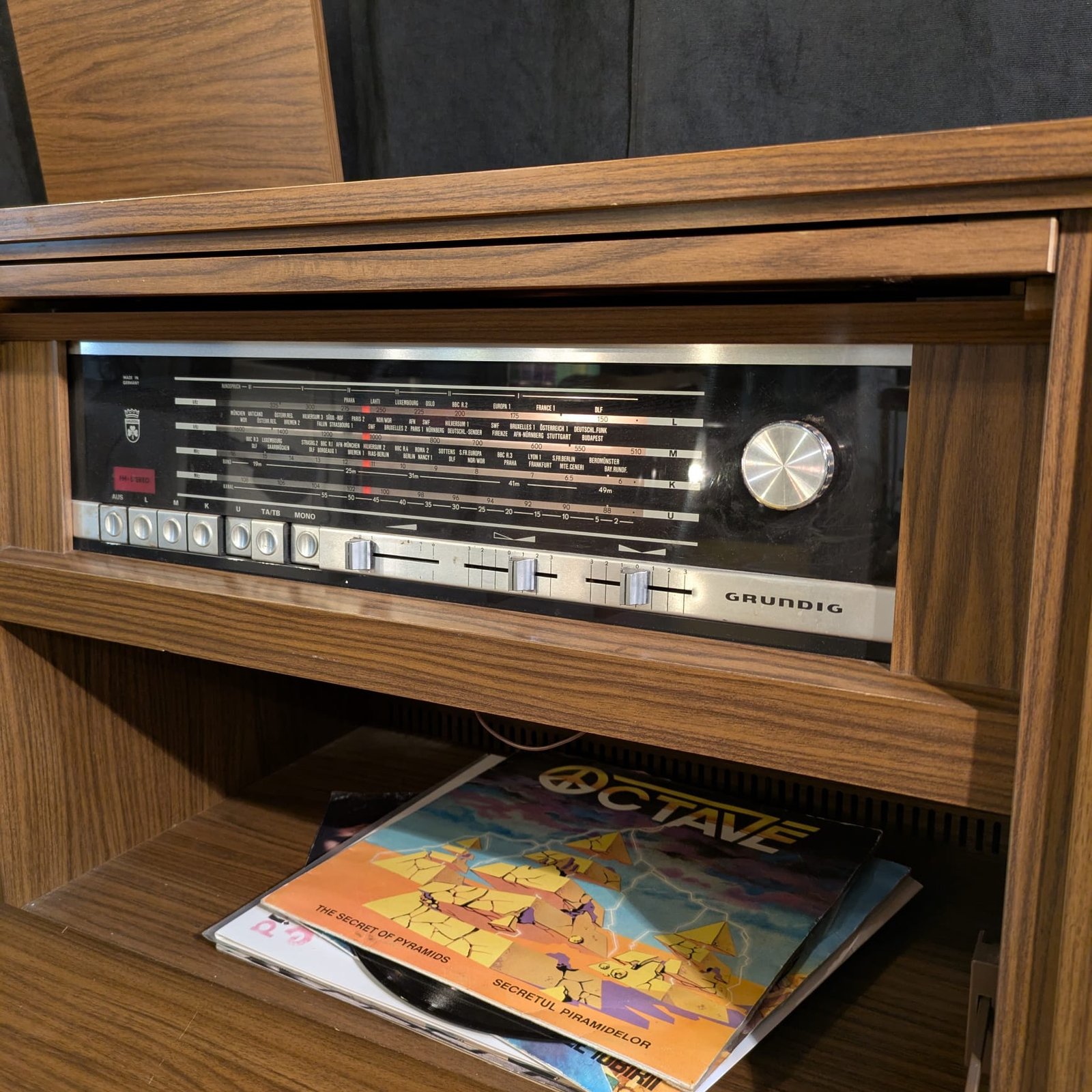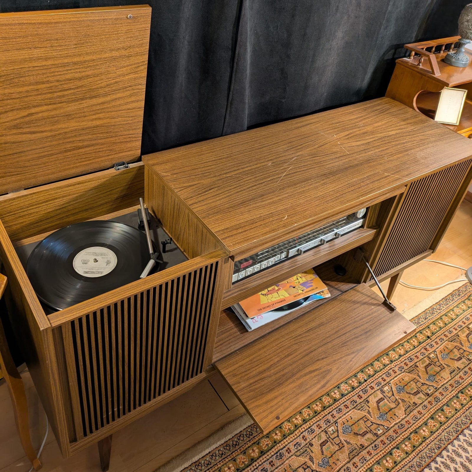 Are pick-up, radio si un spațiu de depozitare (sub radio), toate putând fi acoperite de uși. Prezintă câteva zgârieturi pe blatul superior.