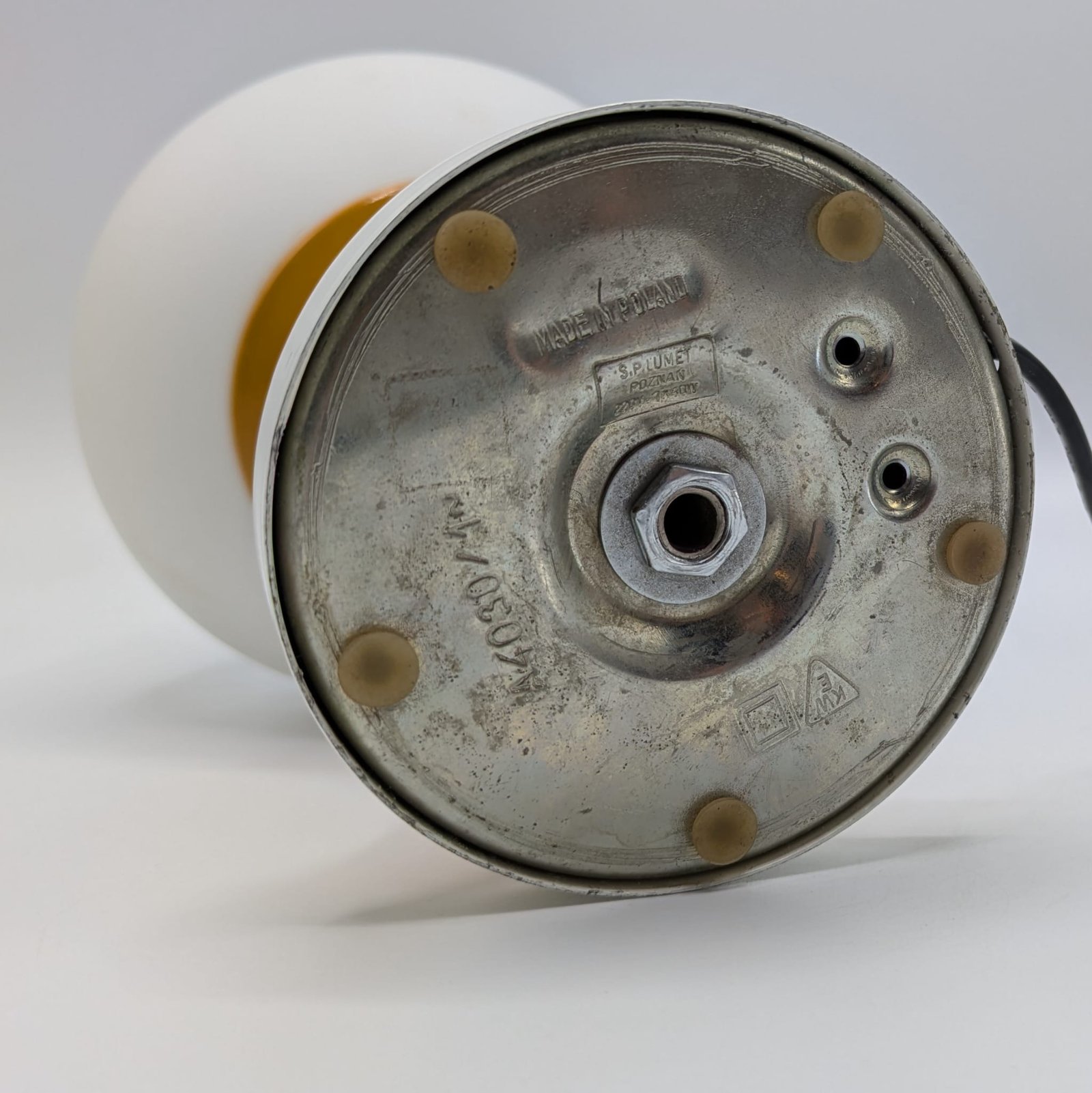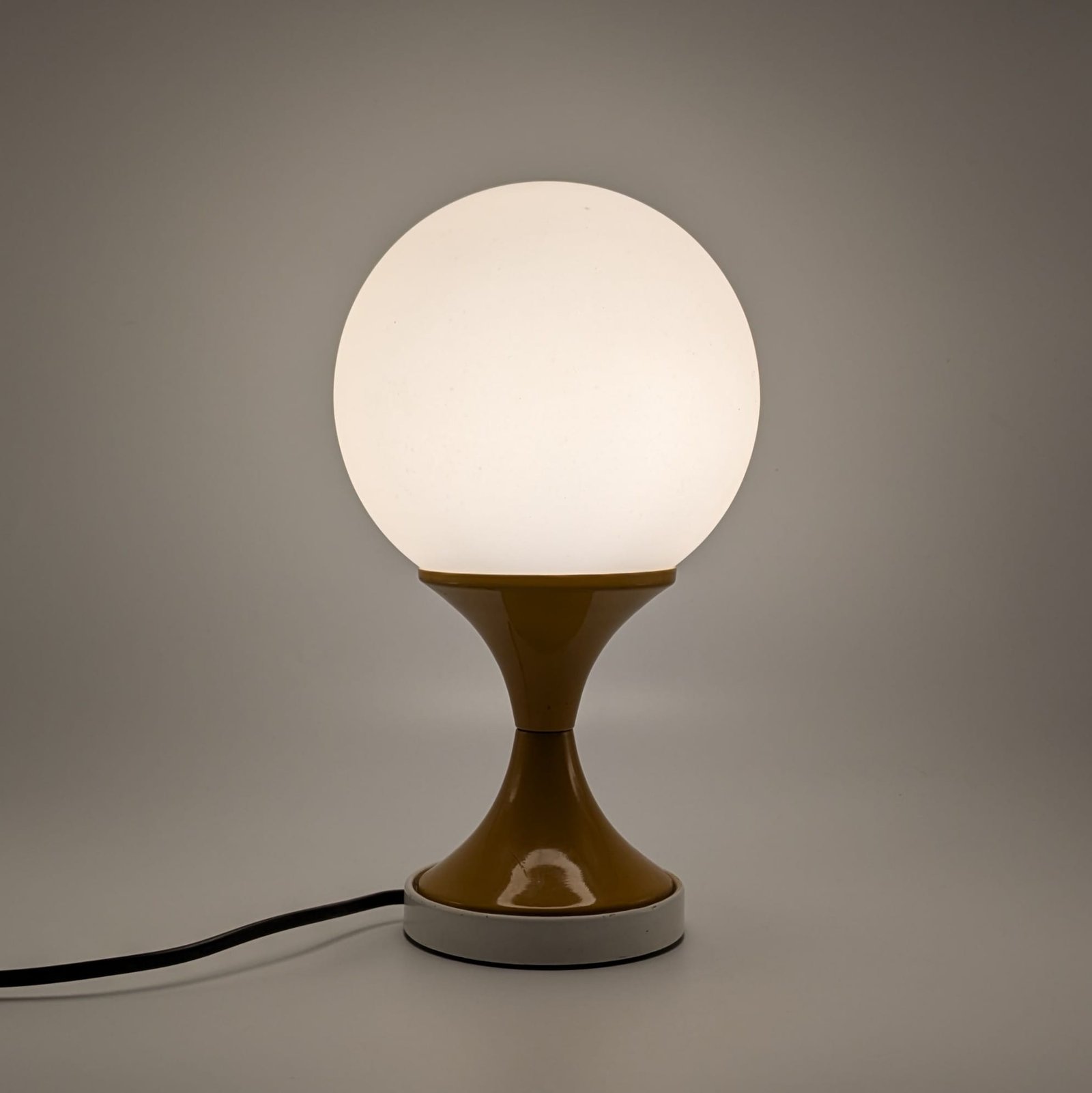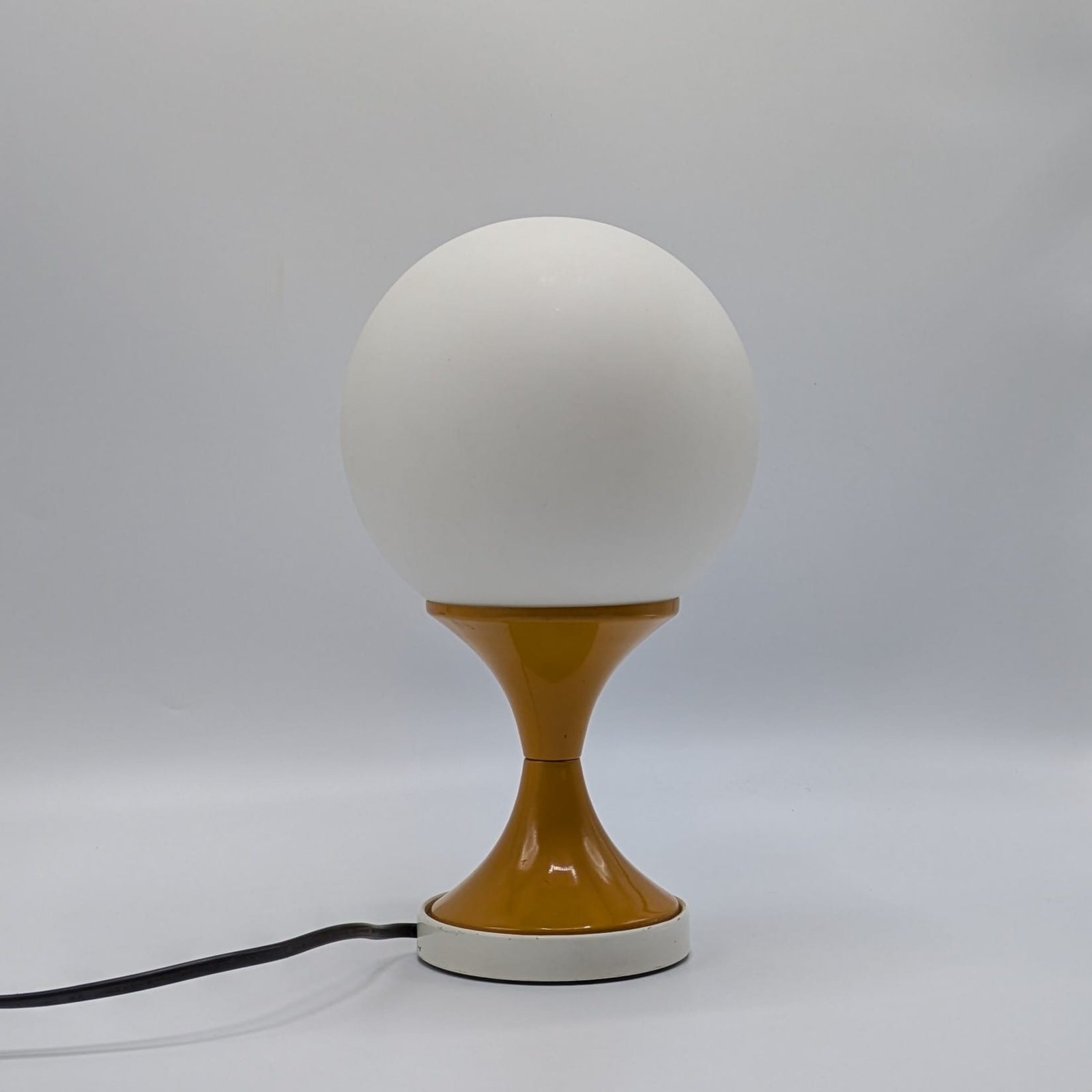 Lampă SP Lumet Poznań Polonia, model A4030/1, cu design Space Age, din anii 1970, bază metalică galben ocru/muștar, abajur din sticlă albă, funcțională și în stare foarte bună, echipată cu bec E14, înălțime 26 cm, diametru bază 10 cm, diametru abajur 14 cm.